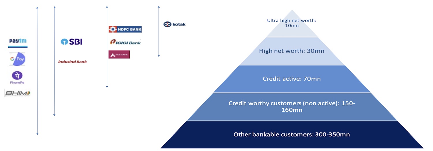 A snapshot of the reach of banks and fintech startups in India. Data: CIBIL, Statista, BofA Global Research. Image: BofA