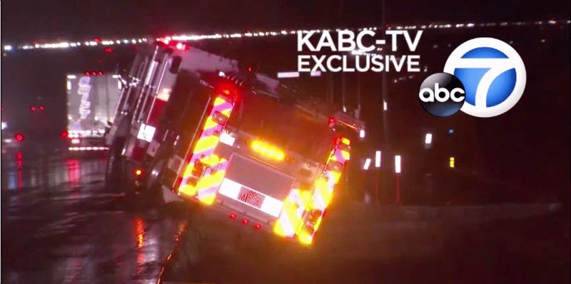 One of the craziest incidents was captured on video by ABC7, and it shows a San Bernardino County fire truck falling over the side of the 15 freeway in the Cajon Pass as the road gave out Friday evening. The Los Angeles Times also has daytime video of the aftermath.