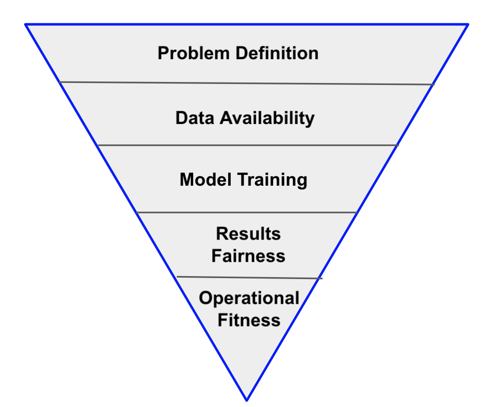 This is the top of the funnel. AI projects require significant investments not just during initial development but ongoing monitoring and refinement. This makes it important to verify that the problem being solved is truly worth solving with respect to potential business value compared to the effort to build. Even if the problem is worth solving, AI may not be required. There might be easier human-encoded heuristics to solve the problem.