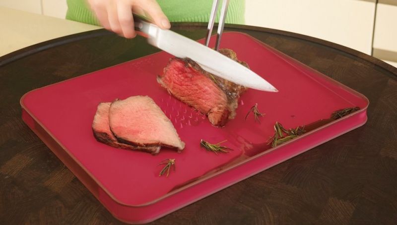 The Joseph Joseph Cut and Carve Plus is a large, double-sided, non-slip, dishwasher safe cutting board. One side is smooth for your standard chopping, while the other has spikes to hold your meat in place as you cut, and is angled to collect that sweet sweet juice for easy pouring from the rounded corners.