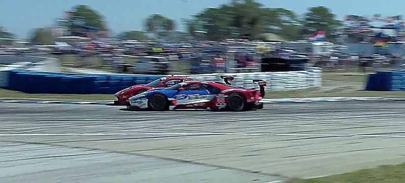 Before the No. 70 Mazda ate the tire wall in spectacular fashion, we got this fierce little scrap between the No. 68 Ford GT and the No. 62 Risi Competizione Ferrari 488 GTE.