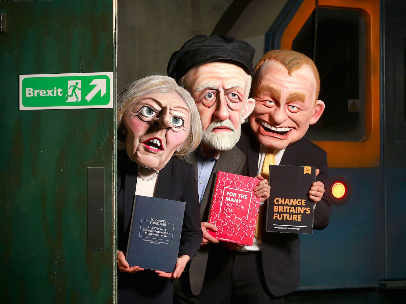 Three actors portraying, from left, Theresa May, Jeremy Corbyn and Tim Farron.Matt Alexander/PA Wire/PA Images