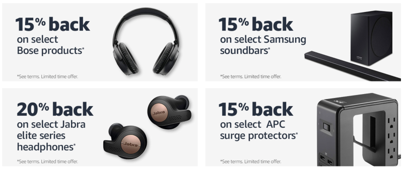 If you’re an Amazon Prime member, it’s worth having the Amazon Prime Store Card or the Amazon Prime Visa to get 5% back on every purchase. But now, the retailer’s offering larger cash back bonuses of up to 20% on select products , including high-end tech like Bose headphones and Samsung sound bars.