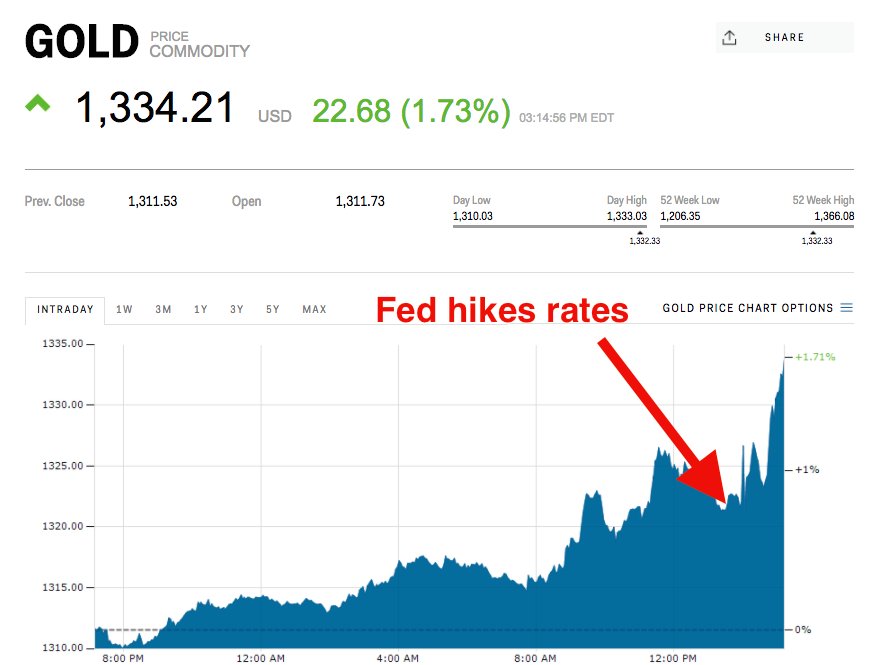 Gold is rallying Wednesday, up 1.73% at $1334 an ounce, after the Federal Open Market Committee raised its benchmark interest rate 25 basis points to a range between 1.50% and 1.75%.
