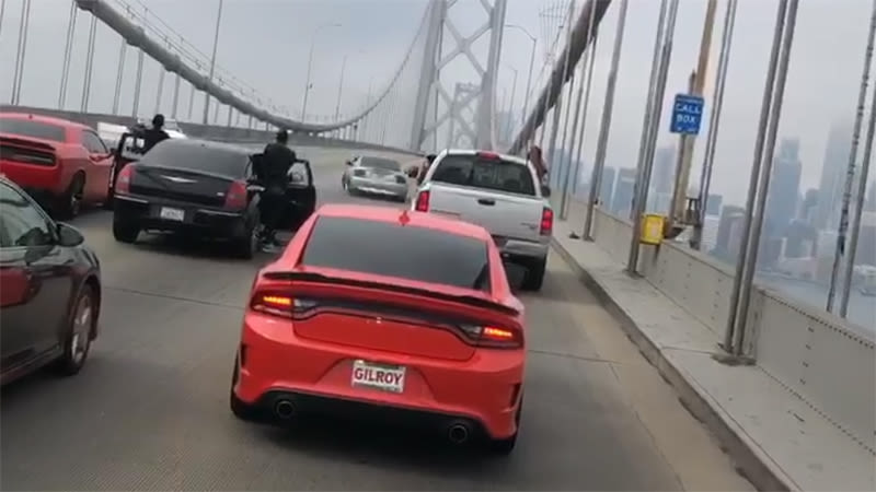 You’re watching a three-car sideshow shutting down the long and lovely Bay Bridge on Sunday morning, quickly prompting the ire of many of the Bay Area’s more uptight citizens, who were all presumably pissed they’d be late to their Burning Man-recreation songversations or whatever it is anybody does in SF anymore.