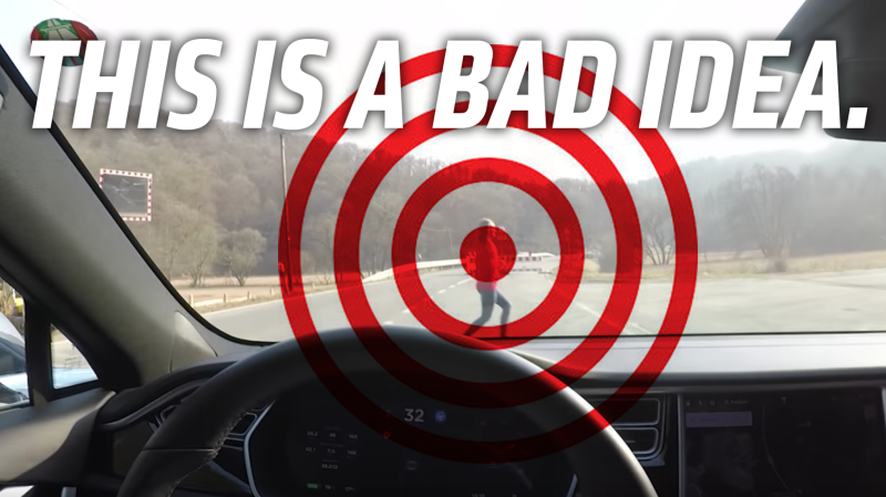 Look, I can’t believe I have to even say this, but in general you shouldn’t drive with the intent of running over a loved one, even if you’re pretty damn sure the car won’t let you actually do it. I mean, I’ve messed about a bit with autonomous vehicles, trying to see if I could fool their sensors or whatever, but walking in front of a car going close to 20 mph with technology still in its toddler years is pretty much just asking for trouble.