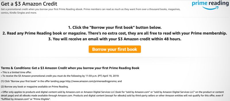 Want $3 to spend on Amazon for free? Just visit this page, click the “Borrow Your First Book” button to jump to Amazon’s Prime Reading library, then pick any book or magazine to add to your library. They’re all free, and once you “borrow” one, you’ll receive an email confirming that a $3 Amazon credit has been added to your account within 24-48 hours. Easy peasy.