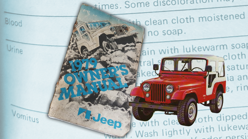While enjoying a typical, romantic Friday evening with a bottle of automatic transmission fluid, a few lit MAP torches and my 1979 Jeep Cherokee Golden Eagle’s owner’s manual, I discovered something amazing: a stain-removal table, which includes information on how to clean various fluids including “vomitus,” blood, “catsup” and urine.