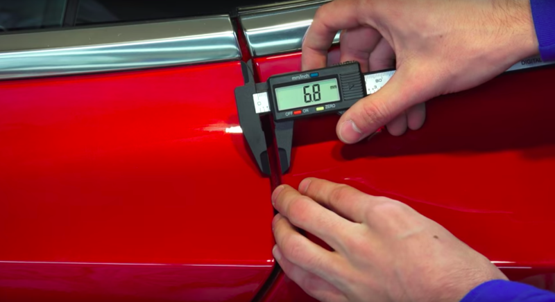 Then Fenske breaks out the calipers to measure body panel fitment, and compares what he finds with that of his Subaru Crosstrek. (He admits in the comments that his measurement method hovering a set of calipers over each gap isn’t quite exact). The Tesla’s hood-to-fender gap, for example is 4.4 millimeters on the driver’s side and 2.4 millimeters on the passenger’s side compared to the Crosstrek’s 3.8 millimeter measurement on the driver’s sides and 3.0 millimeter reading on the passenger’s side.