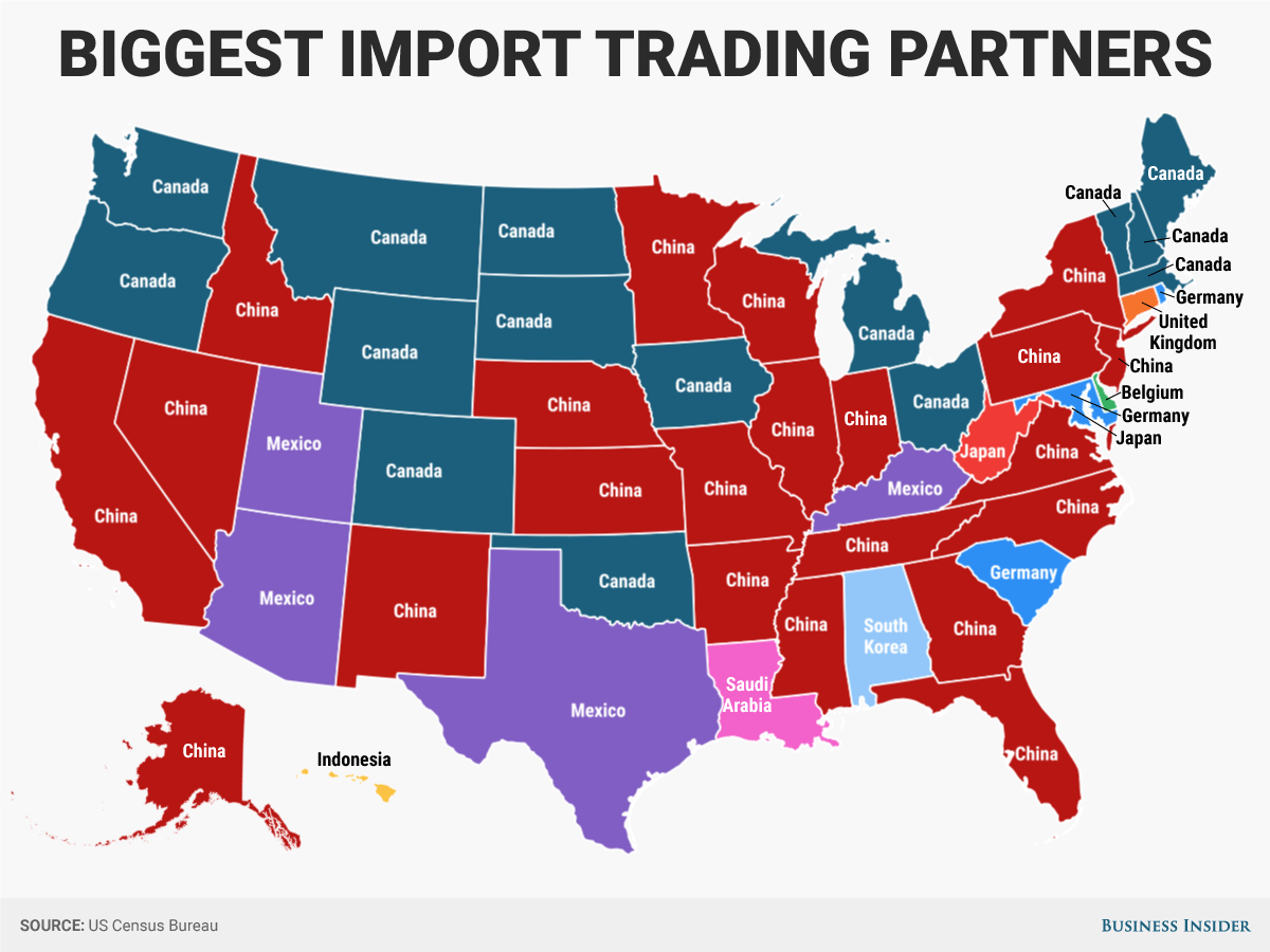Business Insider took a look at each state’s biggest import and export trading partner.