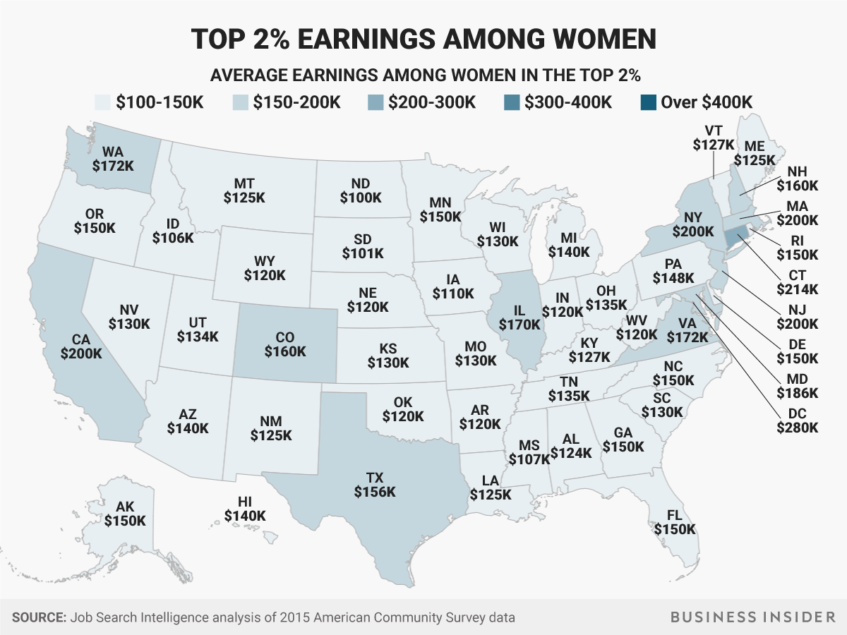 In fact, there are so few women in the top 1%, that to compare the highest-paid men to the highest-paid women in the US, we had to zoom out a bit. Among the top 2% of US earners, men make $371,000 on average, compared to $145,000 for women in the same percentile, according to an analysis of the 2015 American Community Survey by labor economics research firm Job Search Intelligence (JSI).