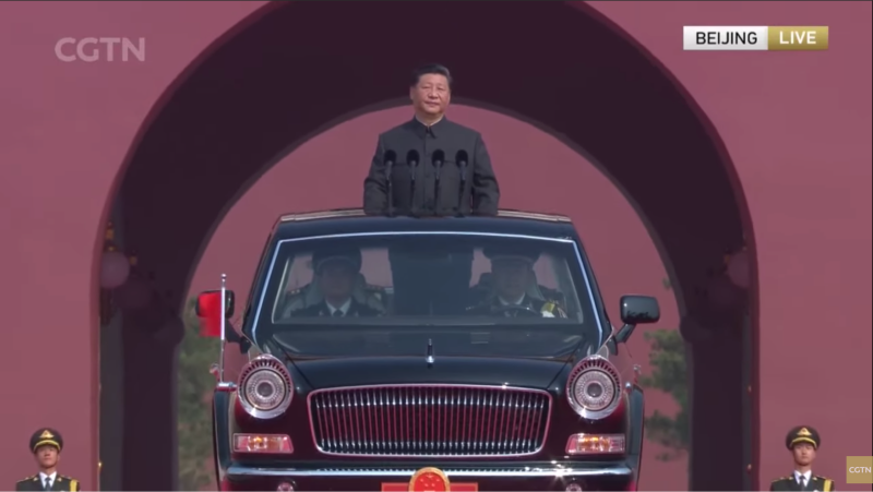 Having reached the end of the military portion of the parade, Xi circles back. Xi does not have a license plate.