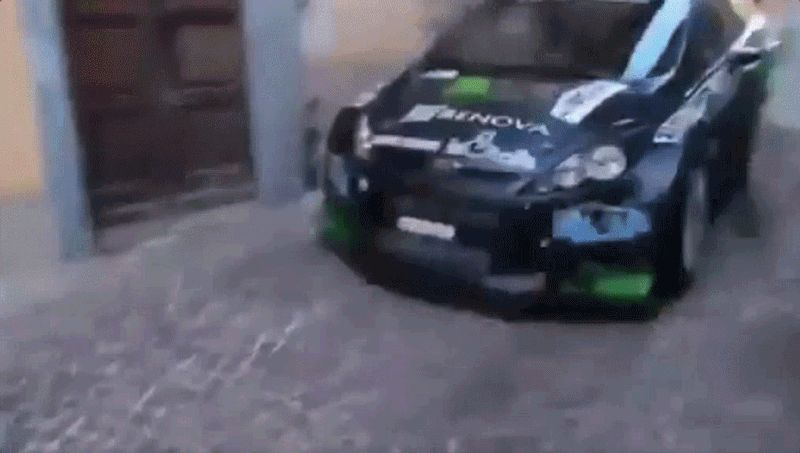 A rally stage actually went through this super-narrow, obviously pre-car street. At first, from this angle, it doesn’t look like they’ll even make it. But they do—just barely.