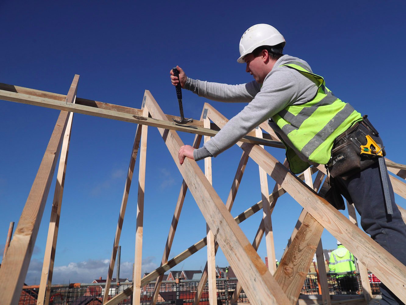 A builder working for Taylor Wimpey builds a roof on an estate in Aylesbury, Britain, February 7, 2017.REUTERS/Eddie Keogh