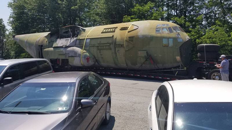 “I saw this at a rest stop in PA,” Jalopnik reader Joe wrote to me. “Any idea what it is?” Well, yes, but I have no idea what the fuselage of a C-130 Hercules airplane is doing getting dragged behind a truck. It makes for quite a sight, though.