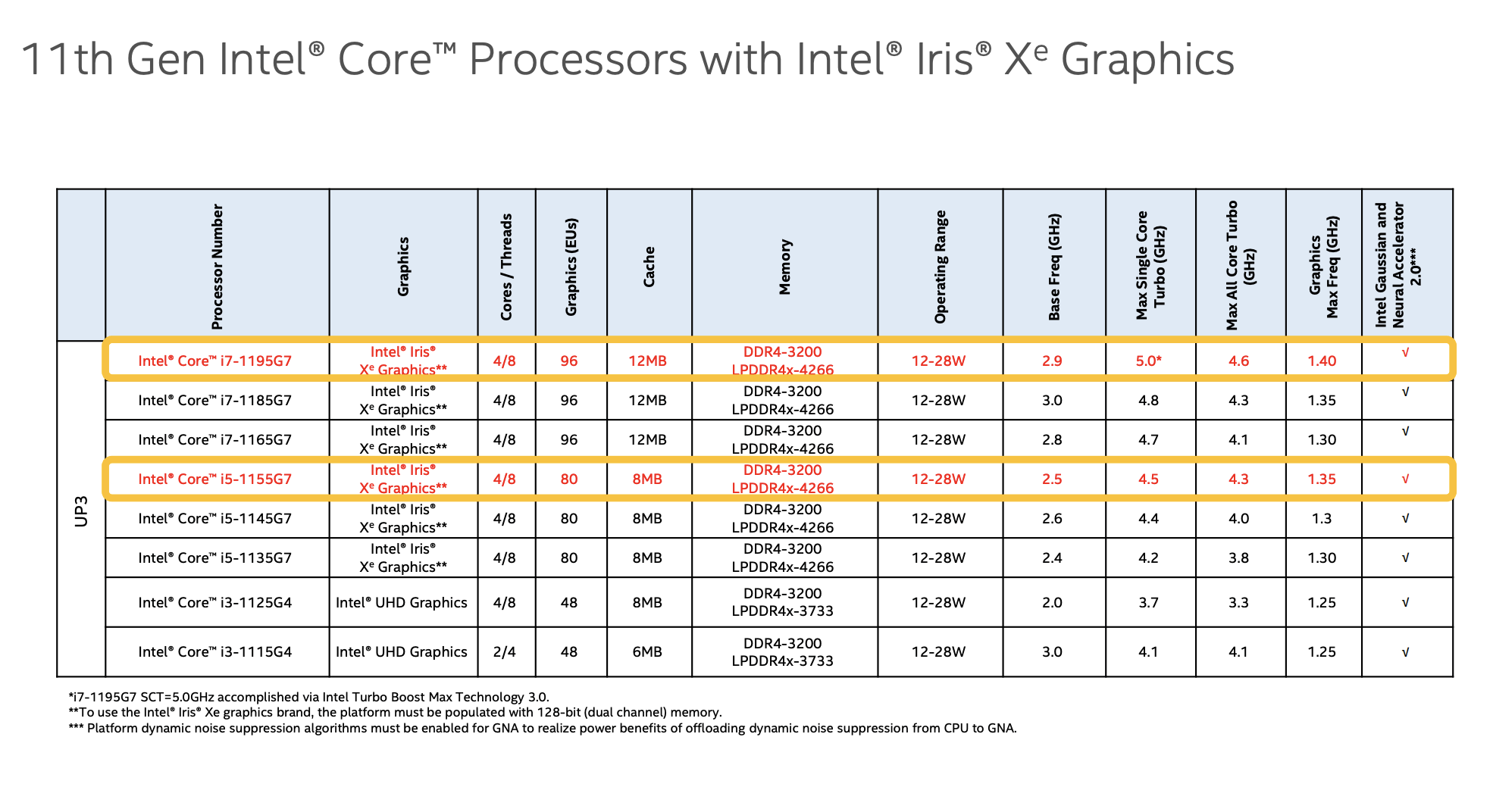 Both of Intel’s new chips have Intel Irix Xe graphics. The flagship model is the Core i7-1195G7, which has base clock speed is 2.9 GHz, but can reach up to 5.0 GHz on a single core using Intel’s Turbo Boost Max 3.0 tech. The other chip, called the Core i5-1155G7, has a base clock speed of 2.5GHzm and a maximum of 4.5GHz. Both chips have four cores and eight threads.