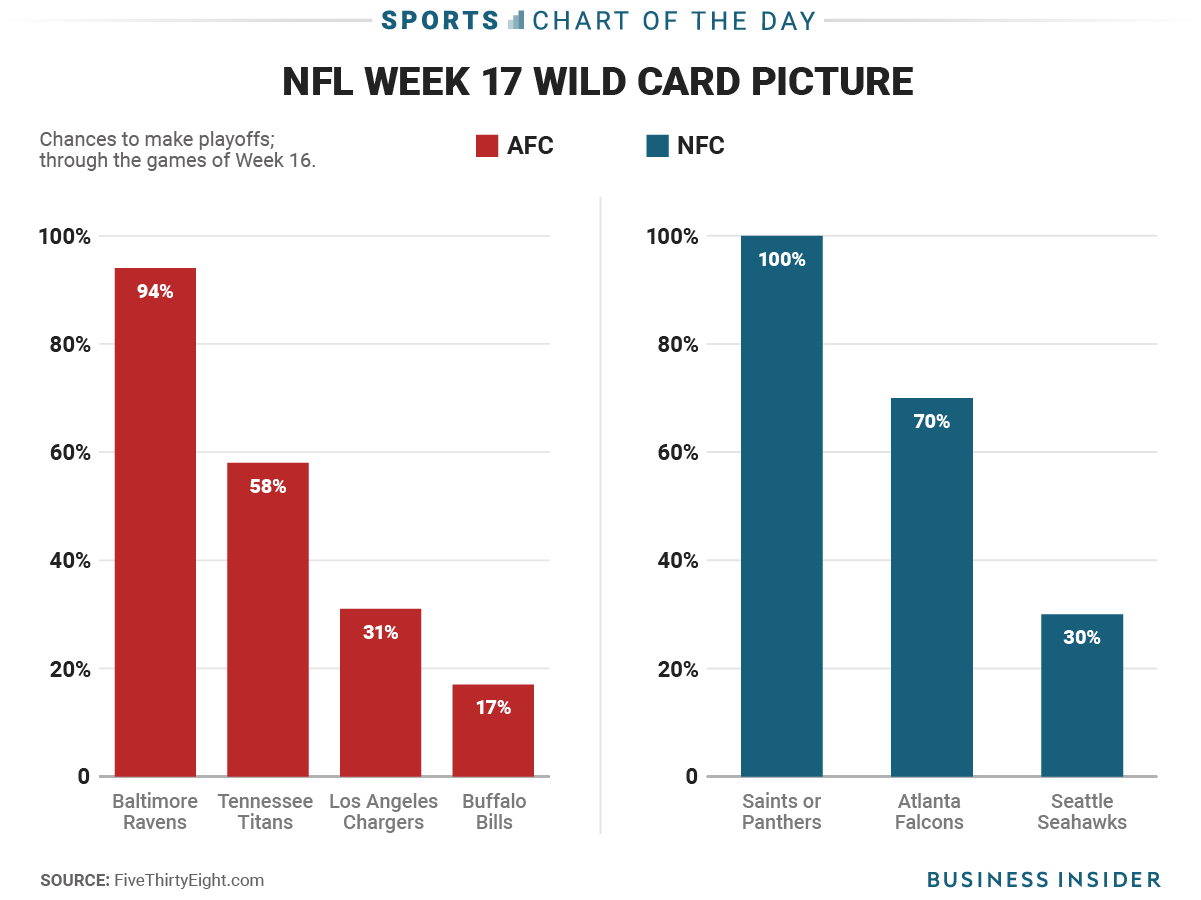 In the NFC, things are fairly simple as one wild-card spot will go to the New Orleans Saints or the Carolina Panthers, whichever team does not win the NFC South. The other spot will go to the Atlanta Falcons or the Seattle Seahawks. According to simulations at the data-journalism site FiveThirtyEight, the Falcons have a 70% shot of securing the final NFC spot.