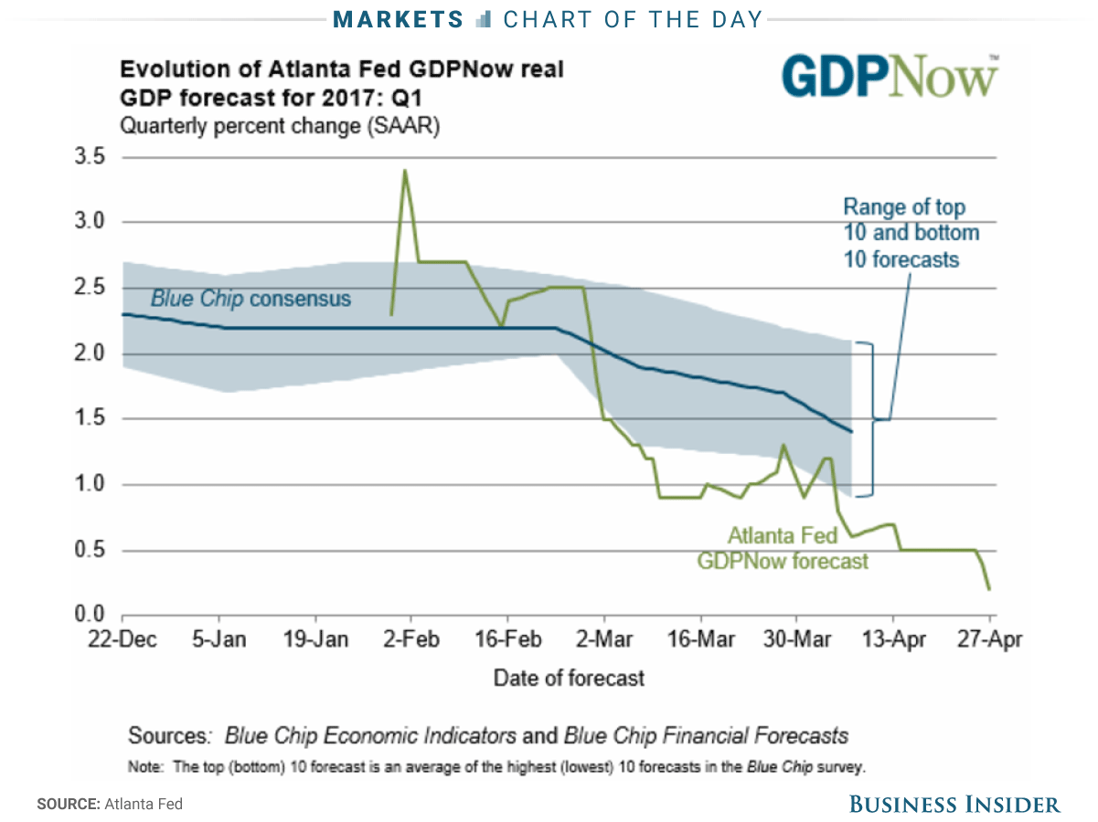 The Department of Commerce will publish its first estimate of US economic growth in the first quarter of 2017 on Friday, and it may show that the economy barely grew at all.
