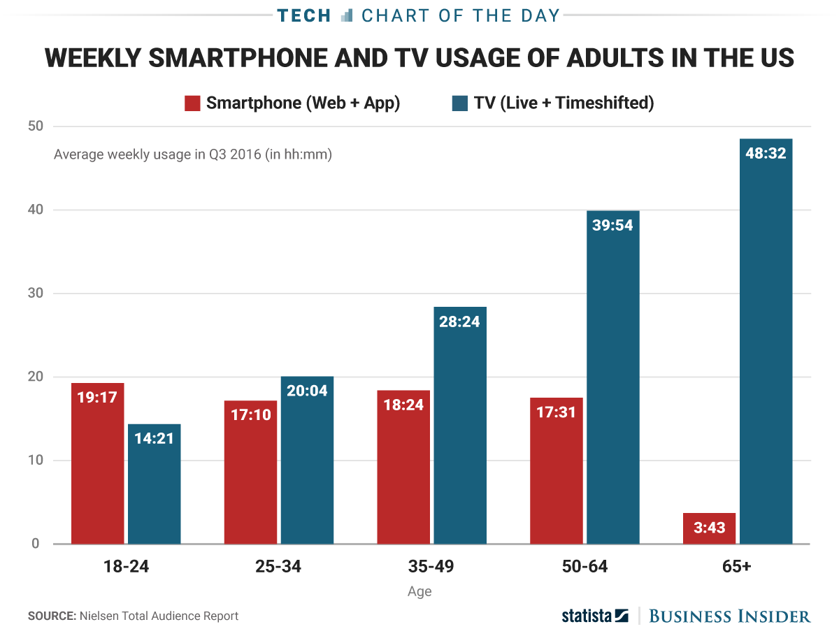 As this chart from Statista shows, though, its grip is starting to loosen. According to the most recent Total Audience Report from research firm Nielsen, young Americans between the ages of 18 and 24 now spend more time using smartphones than watching TV, with about a five-hour gap between the two.