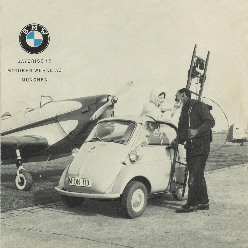 We have a woman in an Isetta, at an airfield, in front of some small planes, affectionately caressing the face of a man holding what looks like a wire hula hoop, and a ladder festooned with… pinecones? Dried herbs? Shaggy gerbil pelts?