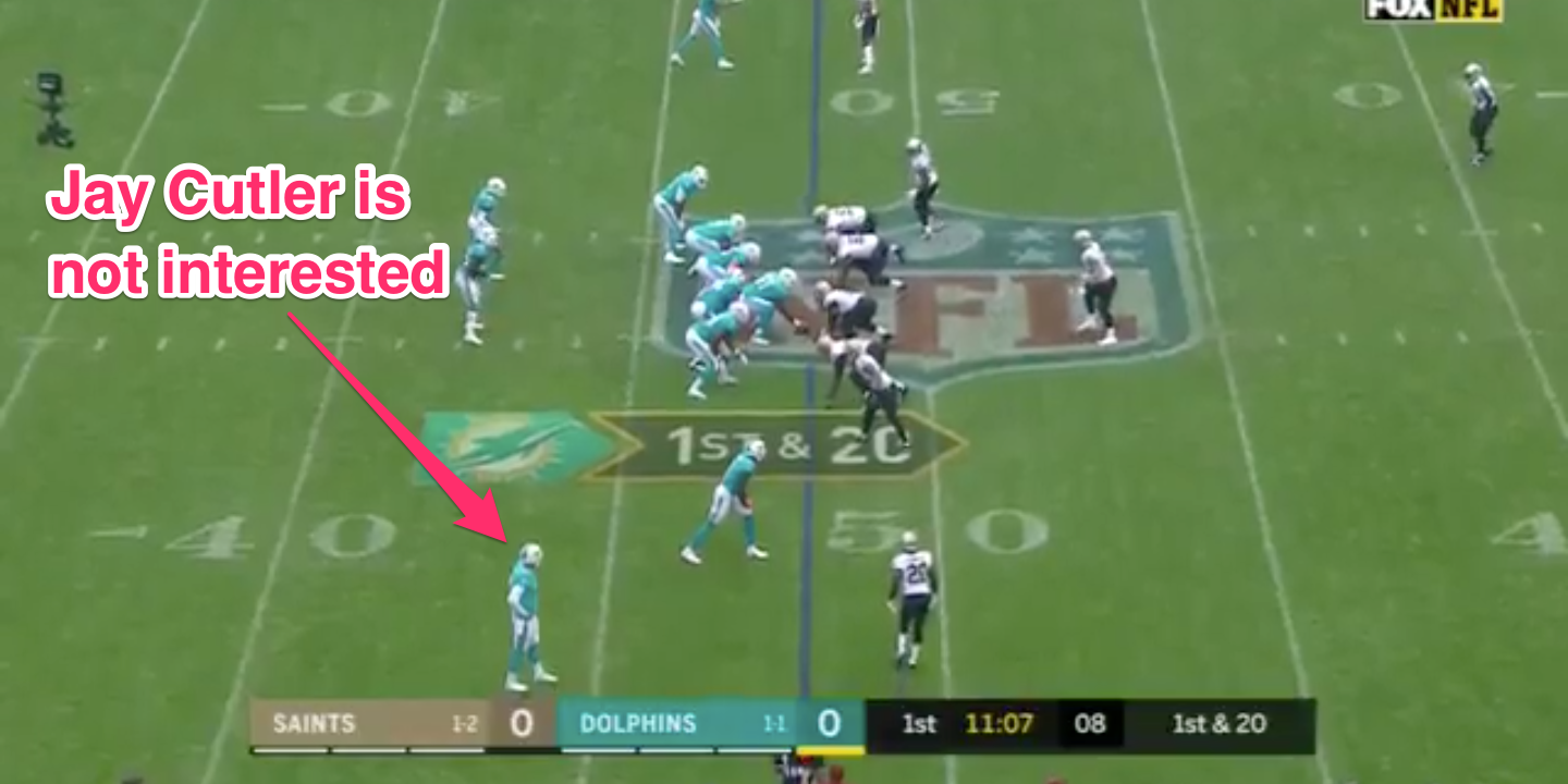 The wildcat calls for the quarterback to be split out wide with a running back or receiver taking the snap. As Miami ran their wildcat play, Cutler split out wide, put his hands on his hips, and basically refused to move at all on the play. Jay Ajayi would lose a yard on the play.