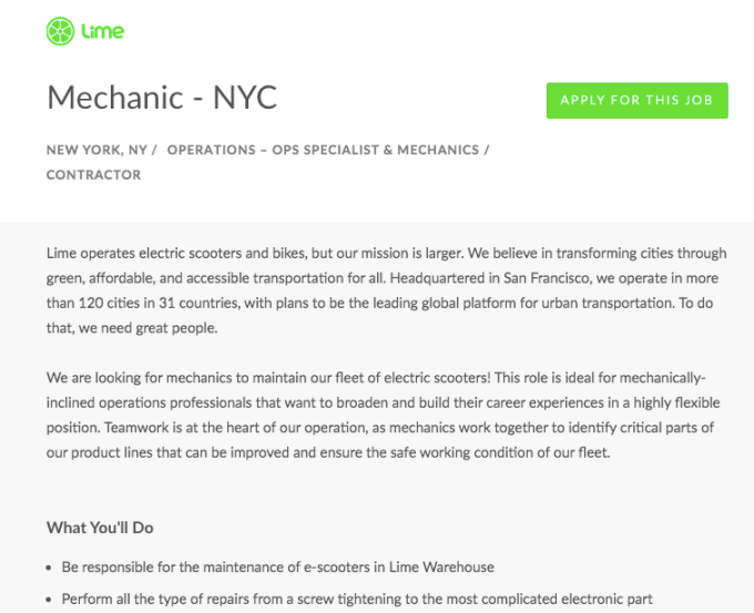 Lime is no stranger to NYC. Its e-bikes have historically had a presence in the Rockaways, Queens. Now it has two job postings up — for a mechanic and an operations specialist — that specifically mention management, maintenance, deployment and retrieval of Lime’s e-scooters.