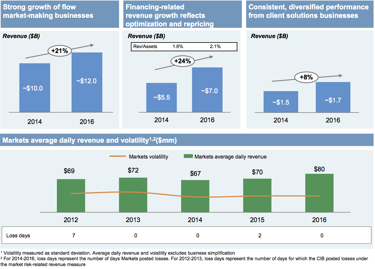 JPMorganThe increase in daily markets revenue is a function of increased revenue across just about every business. Flow market-making revenues increased 21% from 2014 to 2016, while financing-related revenues increased 24%.