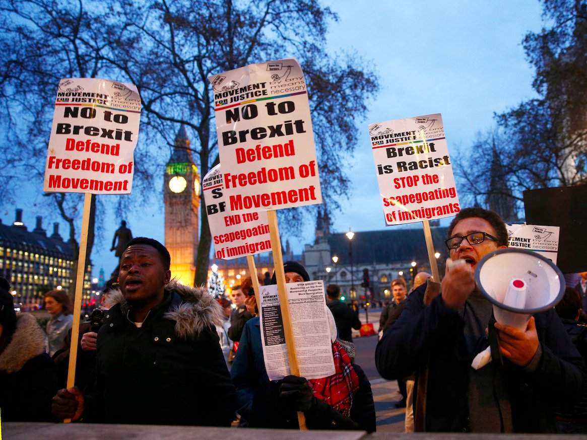 Protesters shout slogans and hold placards outside Supreme Court after the third day of the challenge against a court ruling that Theresa May’s government requires parliamentary approval to start the process of leaving the European Union, in Parliament Square, central London, Britain December 7, 2016.Peter Nicholls/Reuters
