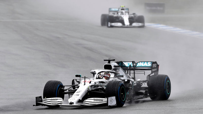 But as the track started to dry out, Mercedes biffed the call to change tires, and both drivers suffered multiple spins on slicks. Valtteri Bottas shoved his Mercedes into the wall, and in spite of two spins, Hamilton managed to finish the race 11th on the track, 9th after penalties were assessed to the Alfa Romeo team.