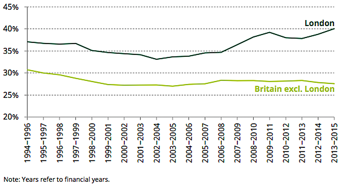 A new IFS report found the rent-to-income ratio in Britain excluding London has fallen by 3% — from 31% to 28% — in the last twenty years, but climbed by 3% — from 37% to 40% — in London over the same period.