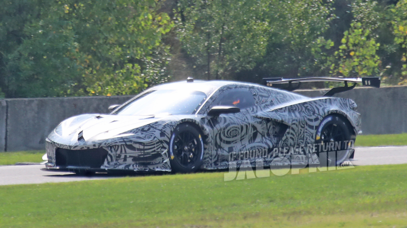 Anyway, beneath that camo livery, you can see a silhouette that is most definitely mid-engined. Plus, it has huge vents cut into its side, presumably to channel air into the engine that’s situated behind the driver. All of that, plus the massive wing and diffuser on the back, mean that this is almost certainly the upcoming C8.R.