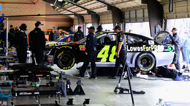 Jimmie Johnson’s team works on the car after failing inspection before the race at Auto Club Speedway in 2018.