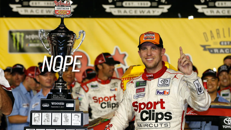 NASCAR driver Denny Hamlin won both the Monster Energy Cup Series and the Xfinity Series at Darlington Raceway this weekend only to have both wins “encumbered” after failing inspection—as in, made moot. Hamlin is still listed as the winner, but his win doesn’t count toward making the playoffs anymore and he receives no points for it.