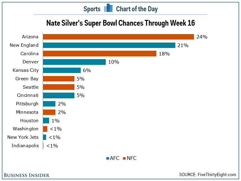 According to the model, the Cardinals have a 24% chance to win the Super Bowl, just ahead of the Patriots at 21%. The Carolina Panthers and Denver Broncos are the only other teams given at least a 10% shot of winning it all. Here are the chances for all the teams that have either clinched a playoff spot or are still in contention for one of the final spots.