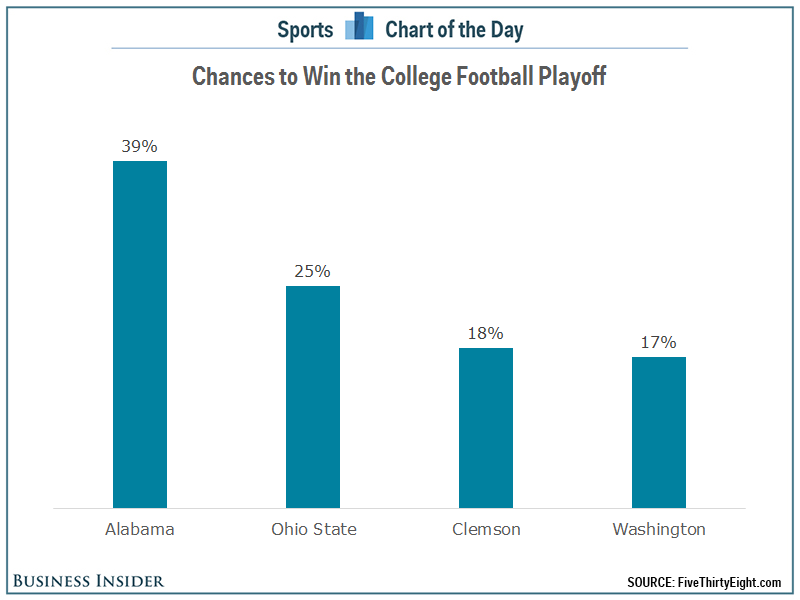 With just three games to go that truly matter, Alabama is the heavy favorite to win it all, according to Nate Silver’s model at FiveThirtyEight.com, with a 64% chance to beat Washington in the semifinal and a 39% chance to be the last team standing. Meanwhile, third-seeded Ohio State is given a slight edge to beat No. 2 Clemson, and a 25% chance to be champs.