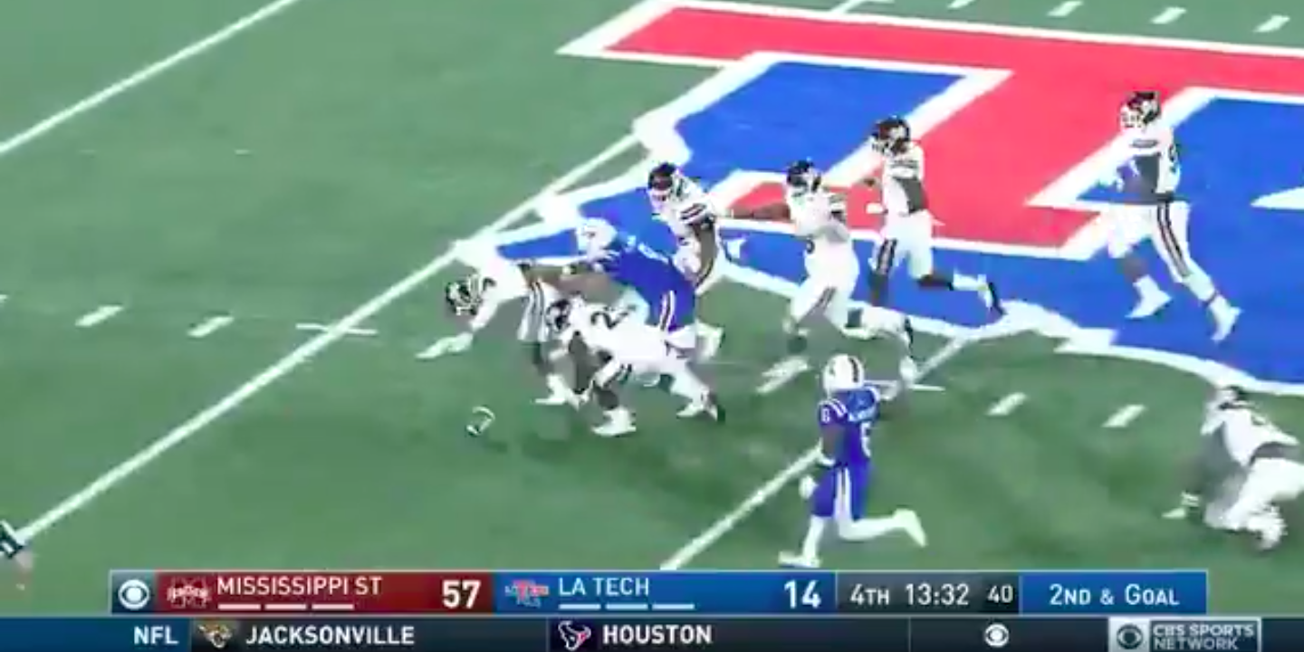 As players from both teams attempted to chase down the loose ball, it was continually missed, kicked, and pushed down field until wide receiver Cee Jay Powell finally fell on the ball for Louisiana Tech 87 yards later. The play left the Bulldogs facing third and goal from their own seven yard line, with 93 yards to go to reach the end zone.