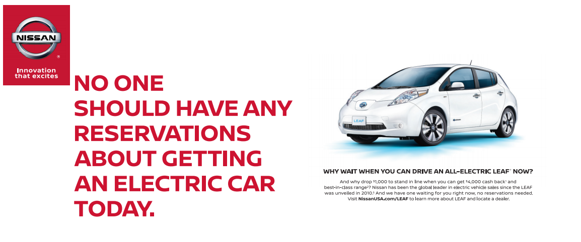 Without mentioning Tesla directly, Nissan makes a few not-so-subtle jabs. The main tagline essentially calls out the Model 3 reservation system. The smaller text also mentions the $1,000 cost to reserve Tesla’s new car (which is fully refundable) and the fact that fans actually lined up to place them when the Model 3 was first announced. Nissan also notes that the Leaf comes with $4,000 cash back for qualified buyers.