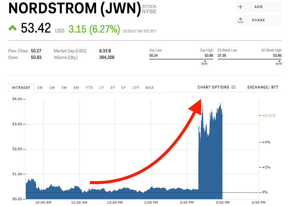 Shares of Nordstrom spiked as much as 7% Friday, to a one-year high, after a Reuters report said management was finalizing plans to take the luxury retailer private before it releases earnings on March 1.
