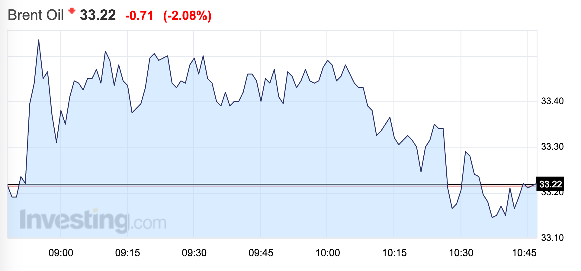Both benchmarks are now back close to their early losses, with the American benchmark, West Texas Intermediate crude slipping 1.8% as of 10:40 a.m. GMT (5:40 a.m. ET). European, or Brent, crude has slipped by 2.1% on the day, with the cost per barrel at $33.22 (£22.80).