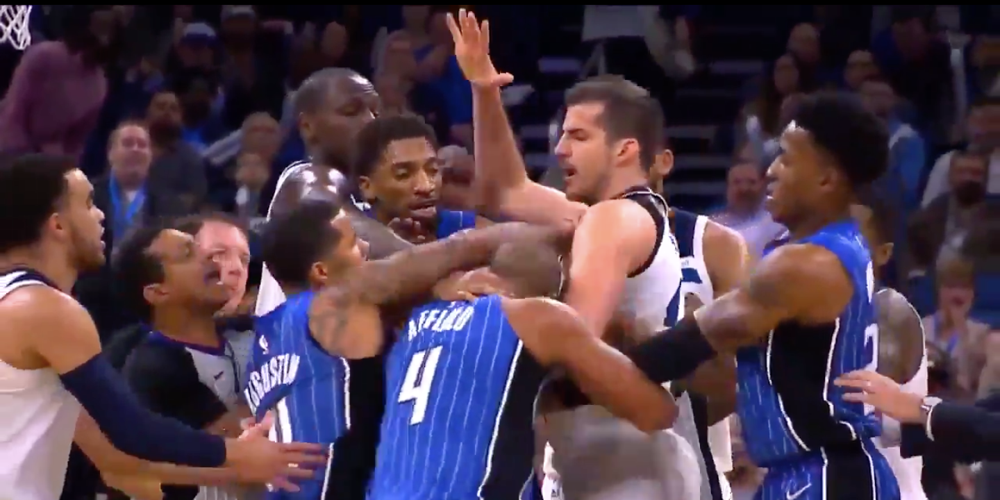 The NBA’s wild week continued on Tuesday as the Orlando Magic and the Minnesota Timberwolves had to be separated after Arron Afflalo threw a haymaker at Nemanja Bjelica, who immediately put Afflalo in a headlock.