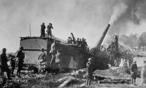 American troops of the 35th Coast Artillery firing 1,200 pound shells from an enormous 14 inch railway mounted gun at the opening...