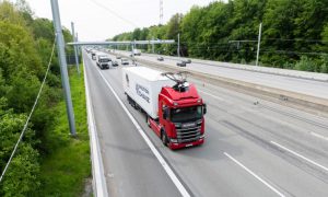 Photo: Siemens Hybrid trucks in Germany can now charge as they drive down a six-mile stretch of the autobahn near Frankfurt, thanks...