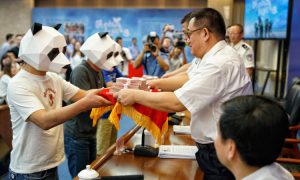 Whistleblowers wearing panda masks receive cash awards for reporting gang crimes from police officers at a news conference in Guangzhou, Guangdong province,...