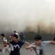 Visitors run away from a wave caused by a tidal bore which surged past a barrier on the banks of Qiantang River,...