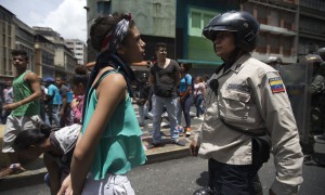 AP Photo/Ariana CubillosA woman confronts a Bolivarian National Police officer during a protest demanding food, a few blocks from Miraflores presidential palace...
