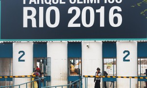 Getty Images/Mario TamaA security guard keeps watch at the entrance to Olympic Park, the primary set of venues being built for the...