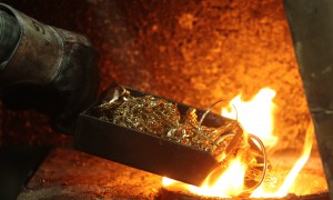 REUTERS/Heinz-Peter BaderA worker places gold jewelry into a melting furnace at the Austrian Gold and Silver Separating Plant “Oegussa” in Vienna on...