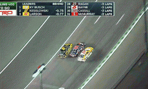 GIF via YouTube Sometimes going three-wide into a turn doesn’t work out. Tonight at Kansas had one of those times. Denny Hamlin...