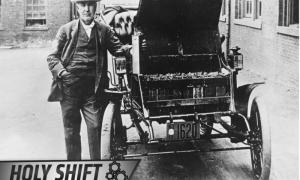 American inventor and physicist Thomas Edison (1847 – 1931) with his first electric car, the Edison Baker. He is holding one of...