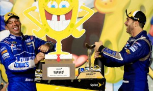 Who lives in a pineapple under the sea? Not these guys, obviously. Jimmie Johnson and Chad Knaus celebrate after winning the 2015...